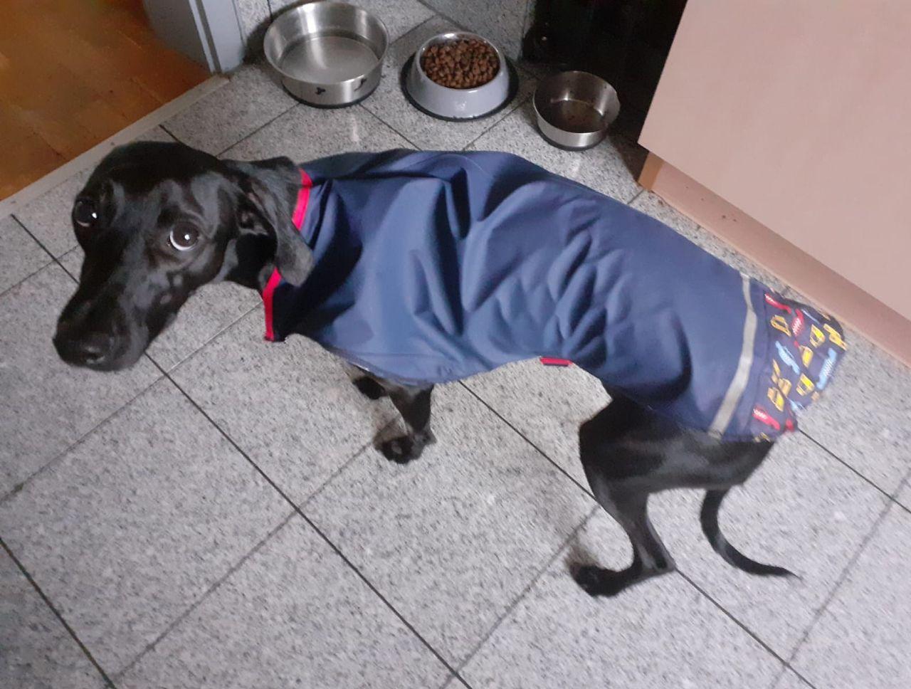 Aus alten Regenjacken und Kindermatschhosen entstehen schicke Hundemäntelchen für Hunde mit besonderen Maßen. Kara ist ein schickes schwarzes Galgomädchen mit enormen Brustkorb und ganz schmaler Taille. Irgendwie fand sich kein passender Mantel, der auch genug Platz zum Herumtoben lässt. Aus einer Regenhosen entstand ein Flitzemäntelchen nach Maß. Schön warm gefüttert, regendicht und mit lustigem Design.